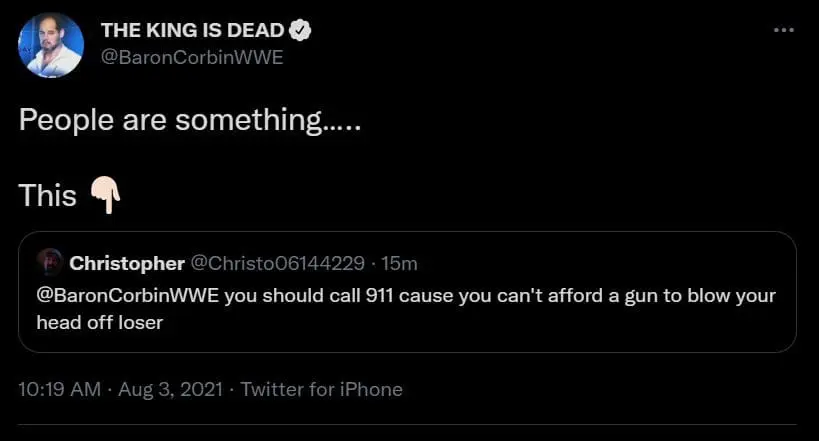 One fan tweeted out to Baron Corbin suggesting that he can’t even “afford a gun” to shoot himself in the head. This fan also suggested that Corbin call 911 in the meantime since he is so broke.