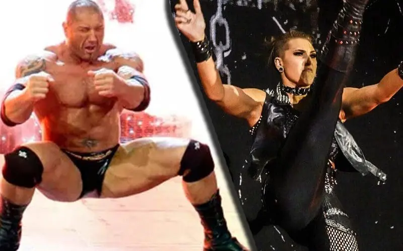 Similar to Batista, Rhea Ripley also stomps her right foot on the entrance ramp before she motions to the fans. WWE shared a recent video featuring Liv Morgan and Rhea Ripley. In the comment section, Batista suggested that Rhea Ripley is copying his entrance.