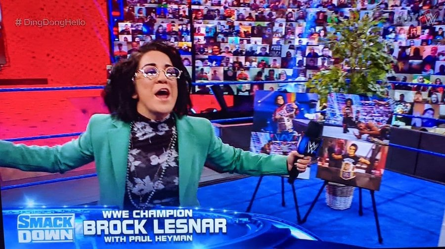 When Bayley came out, WWE flashed a graphic on the screen, but it was not correct. They called her “WWE Champion Brock Lesnar with Paul Heyman.”