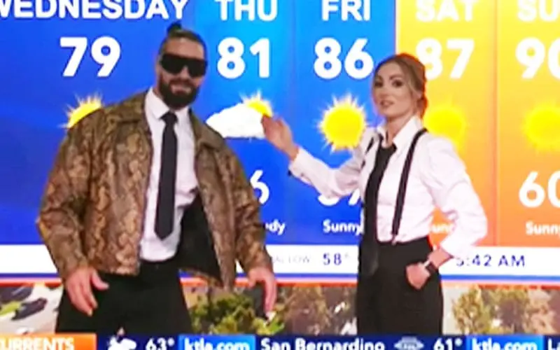 KTLA took to their Instagram and uploaded a video of Becky Lynch and Seth Rollins giving the weather forecast for Los Angeles. While presenting the weather, Becky Lynch mentioned that it would get a bit windy during the day and advised people to either avoid wearing hats or make sure they’re on tight. She added that Thursday would be overcast with a high of 72 and a low of 55, suggesting a sweater might be needed.