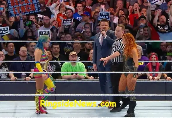 Asuka kicked out after a top rope Becksploder Suplex and then they did each other’s submission holds. Finally, Becky Lynch latched on the Dis-Arm Her and then Asuka was able to turn it into a two count.