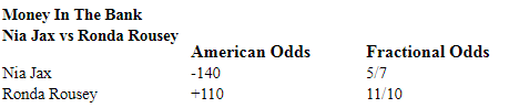According to Bet Online, Nia is the favorite at -140. This means that you have to place a $140 bet to profit $100 on a Jax win. A $100 bet on Rousey would profit $110. These odds can certainly change between now and next month’s event.