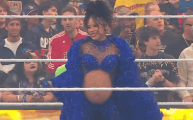 After thanking fans for their support, Bianca Belair said that she missed the fans too. She brought up the fact that John Cena needs to add one more to the attendance list. Then she took off her robe to reveal that she is very pregnant. She announced that the EST is having a baby with her husband, Montez Ford.