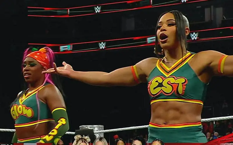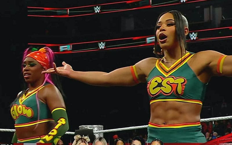 Raquel avoided a Pop Rocks and hit a big boot for a near fall. Then Bianca Belair’s music hit, and she came out to confront Liv Morgan. Naomi joined her, and the WWE Women’s Tag Team Champions, complete with Bring It On style cheerleader outfits, caused a distraction.