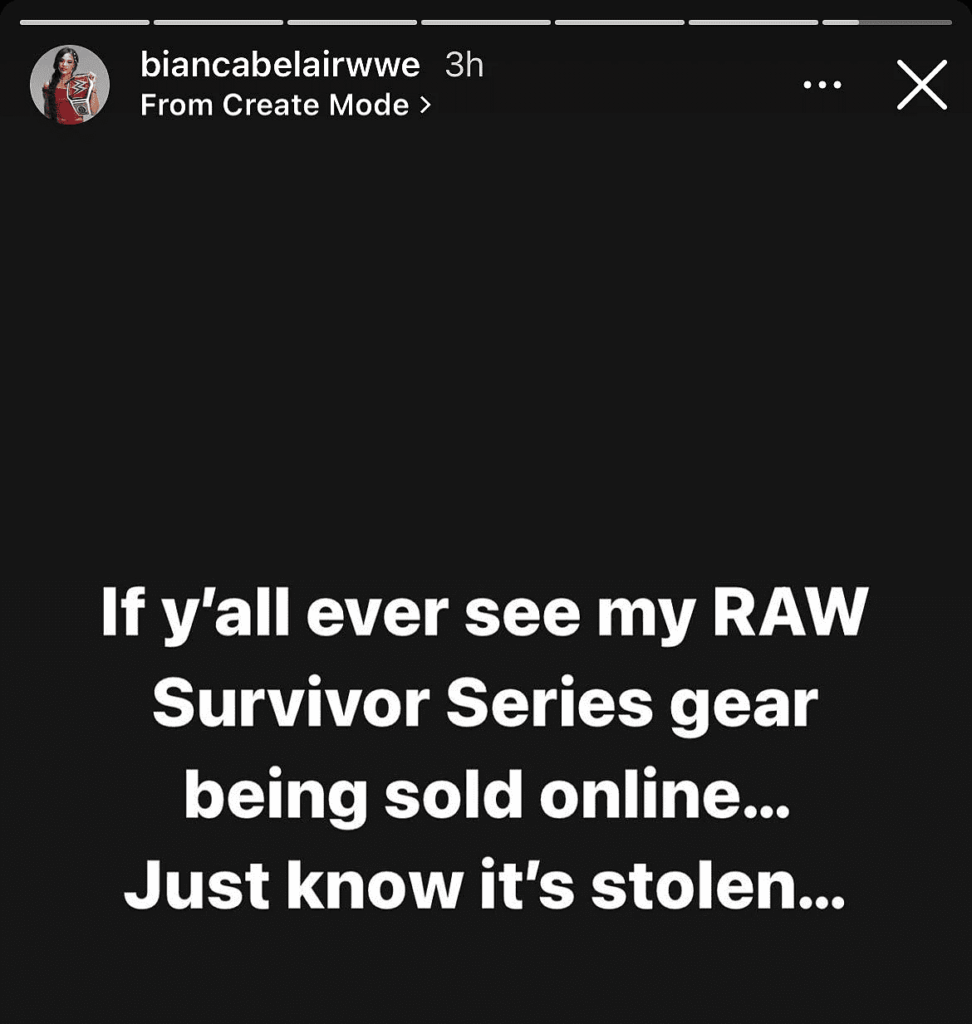 Bianca wore custom gear for the show with the Raw logo on it as well. Belair took to her Instagram story and revealed that her Survivor Series ring gear has been stolen.