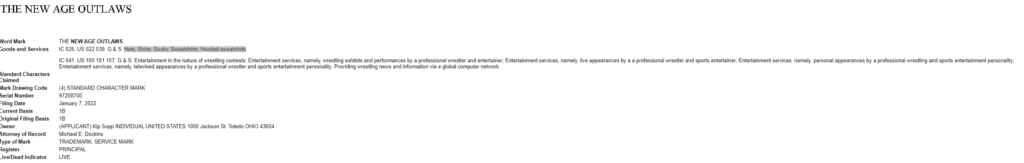 Billy (real name Kip Sopp) has filed to trademark the “New Age Outlaws” name with the United States Patent and Trademark Office. The move comes as a surprise, as it does not appear that WWE has any active claims on the name. If the application is successful, Gunn would be able to sell merchandise with the name on it.