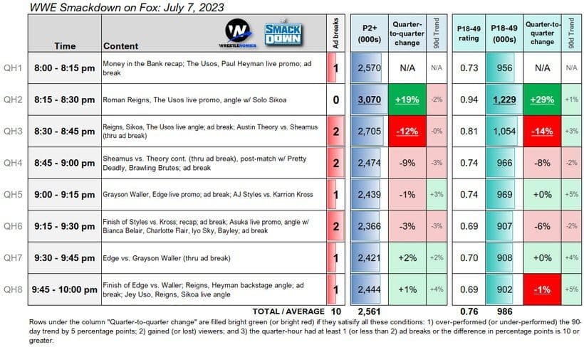 As we previously reported, Alfred Konuwa said that the July 7th episode of WWE SmackDown brought in an overnight viewership of 2.375 million, with a .7 in the 18 to 49 demographic. That was their Money in the Bank fallout, and the Bloodline’s segment got over 30 minutes to kick off the broadcast.