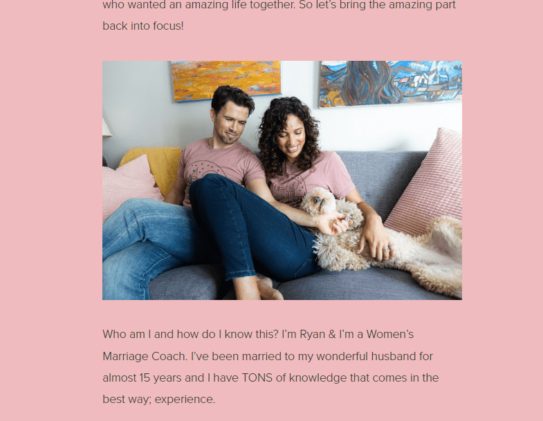 "Who am I and how do I know this? I’m Ryan & I’m a Women’s Marriage Coach. I’ve been married to my wonderful husband for almost 15 years and I have TONS of knowledge that comes in the best way; experience (...) These days our relationship is pretty epic if I do say so myself! We’ve got two wonderful little girls, an adorable Mini Goldendoodle puppy, live in beautiful Southern California, and love creating our dream life together."