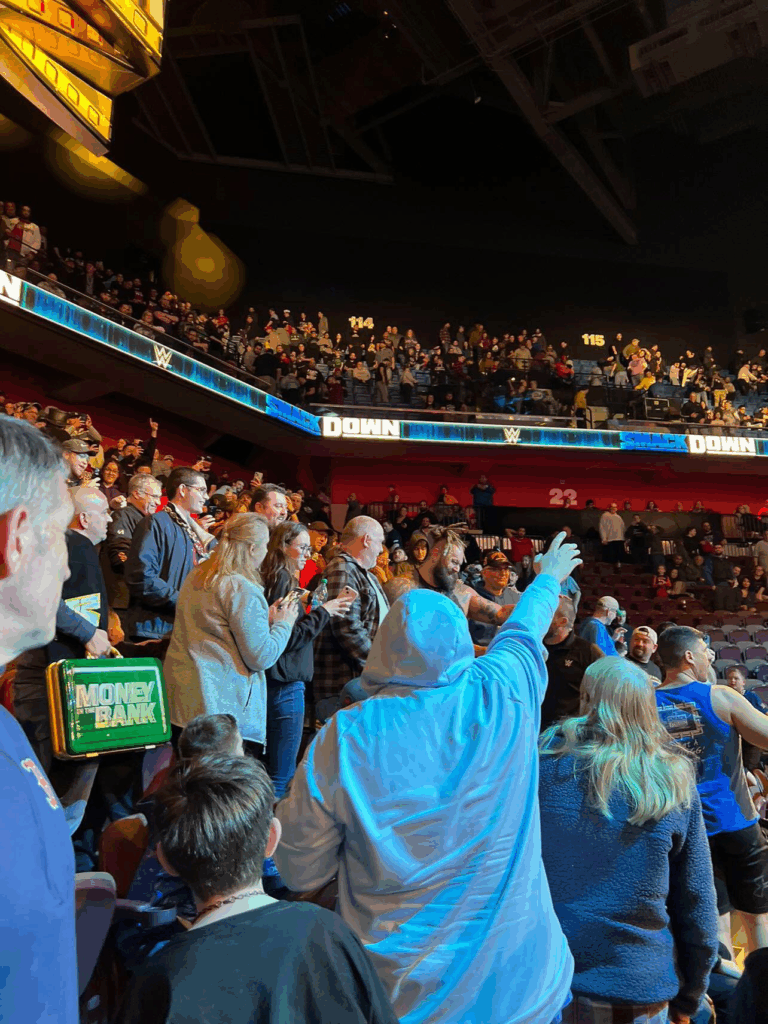 The Eater of Worlds did not appear on live television programming this week. However, in a photo clicked by a fan in attendance, Bray Wyatt can be seen in the stands having a slight meet n greet session with the WWE universe who came to see SmackDown. This was after he beat LA Knight in a dark match.