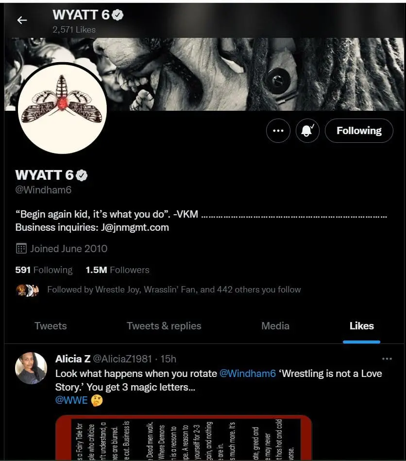 "Look what happens when you rotate @Windham6 'Wrestling is not a Love Story.' You get 3 magic letters… @WWE 🤔"