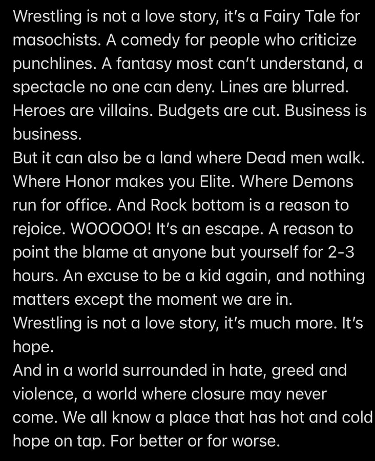 Wrestling is not a love story, it's a Fairy Tale for masochists. A comedy for people who criticize punchlines. A fantasy most can't understand, a spectacle no one can deny. Lines are blurred. Heroes are villains. Budgets are cut. Business is business. But it can also be a land where Dead men walk. Where Honor makes you Elite. Where Demons run for office. And Rock bottom is a reason to rejoice. W00000! It's an escape. A reason to point the blame at anyone but yourself for 2-3 hours. An excuse to be a kid again, and nothing matters except the moment we are in. Wrestling is not a love story, it's much more. It's hope.
