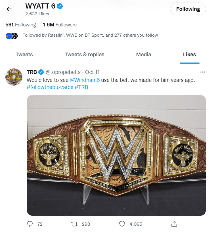 The official Twitter handle of Top Rope Belts created a custom Universal Championship belt for Wyatt years ago and shared the photo of the title. Wyatt also liked that tweet, hinting at possibly becoming the champion eventually. Or, at least he’s looking for custom title belt design ideas.