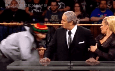 A fan in a reggae beanie jumped in the ring and tackled Bret Hart. They quickly cut to black and then cut back to just the crowd. When they went back to the ring — which was the stage — it was filled with WWE legends including The Big Show, Edge, Beth Phoenix, Heath Slater, and more.