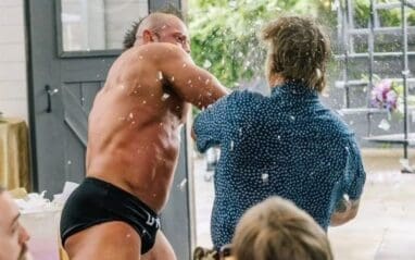 Brian Cage decided to make his presence known at Jon Baker and his bride Angela’s wedding. As one can tell from the photos, it was pure chaos as Brian Cage ended up breaking a bottle on someone’s head. Cage also put another guest through a table before Cage celebrated with the groom.