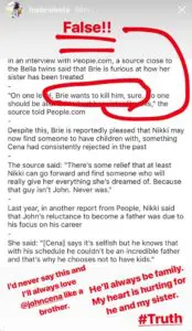 But Brie didn’t take long to set the record straight on the matter. She posted a screenshot to her Instagram story of an article including the quote from People which you can see in below. Bella circled the line about her wanting to kill Cena and said “false!!”