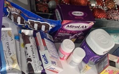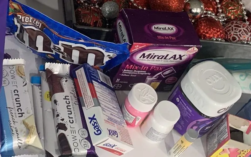 Baker included some white cheddar puffs, crackers, crispy M&Ms, and laxatives. She included a few more items to round out a care package full of essentials.