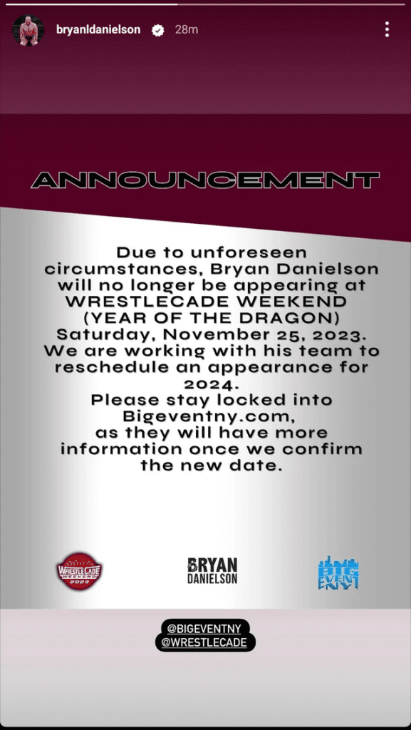 ”Due to unforeseen circumstances, Bryan Danielson will no longer be appearing at WRESTLECADE WEEKEND (YEAR OF THE DRAGON) Saturday, November 25, 2023. We are working with his team to reschedule an appearance for 2024. Please stay locked intc Bigeventny.com, as they will have more information once we conf the new date.”