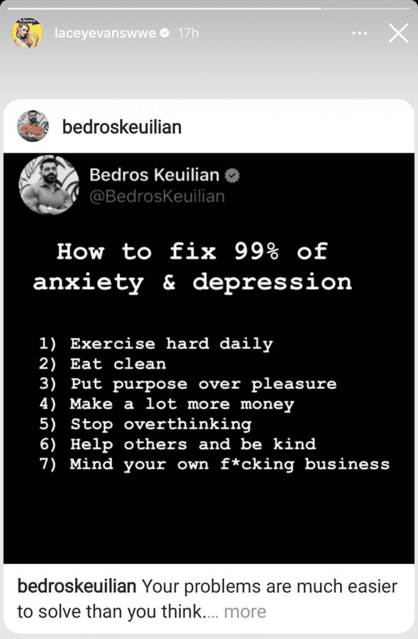 The Lady of WWE re-posted a message on her Instagram story from Bedros Keuilian that broke down anxiety and depression. Bedros suggested to exercise hard every day, eat well, and make a lot of money.
