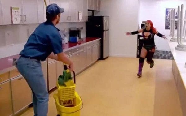 When anyone, Vince, Stephanie, etc. made a cameo their music would play. Then a janitor, who was played by Kane Prichard, who is Bruce’s son and was in fact, named after Glenn Jacobs, was mopping the floor. Brooke ran on the wet floor and took a pratfall.