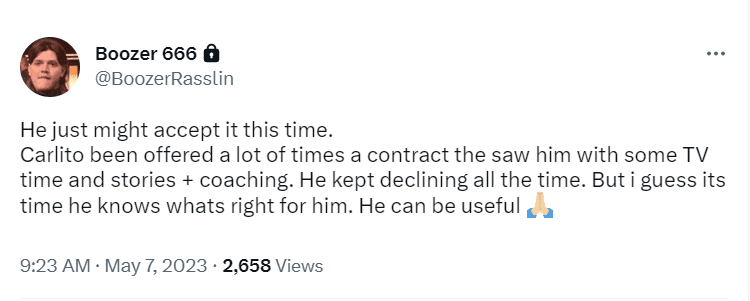 For a long time, Carlito had not expressed an interest in returning to WWE for any kind of long-term role. According to a report by Boozer 666, who has consistently nailed reports in the past, it was stated that Carlito might accept a WWE contract this time around and appear on WWE television.