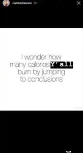 “I wonder how many calories y’all burn by jumping to conclusions,” was the meme of choice for Carmella. But this ambiguity could still lead some to believe a relationship with Cena isn’t out of the realm of possibility because this didn’t seem like a flat-out denial.
