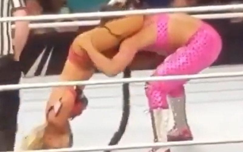 You never know what can happen at a WWE live event, and fans at this weekend’s house show got quite an experience. Bianca Belair and Carmella had a match at one of those house shows, but Mella’s wardrobe had a mind of its own. That didn’t stop her from powering through.