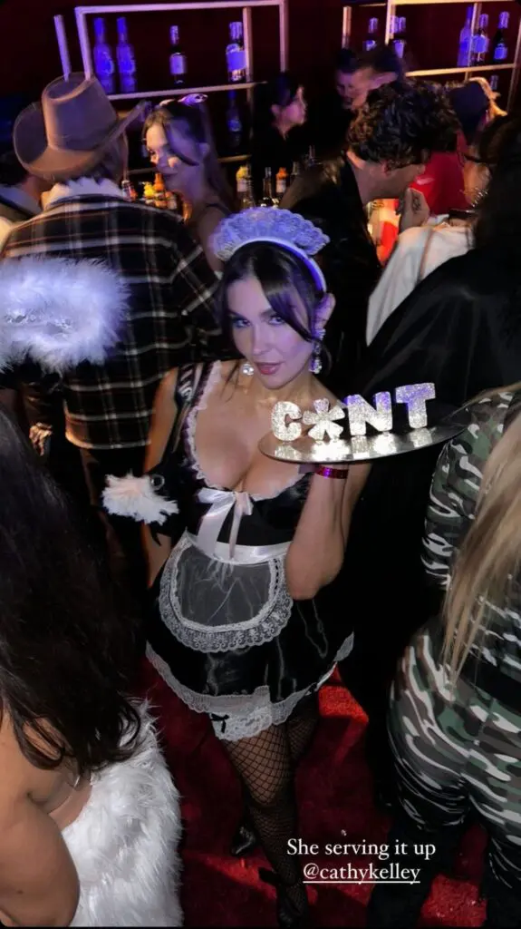 While rocking a maid’s outfit, Cathy Kelley had the word “C*NT” on a platter. The joke is that she was “serving up c*nt,” which is a popular expression. It also may be one that she owned for Halloween.