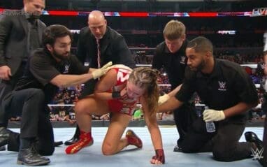 Ronda Rousey and Charlotte Flair were having a very competitive wrestling match and then all of a sudden, Flair decided to grab a kendo stick and start teeing off on The Baddest Woman On The Planet. Their match ended via DQ and then Rousey continued a post-match beatdown that was pretty extensive.