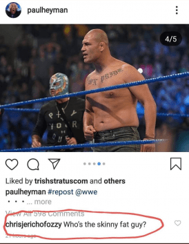 Y2J replied to a photo of Cain Velasquez in the ring asking: “Who’s the skinny fat guy?”