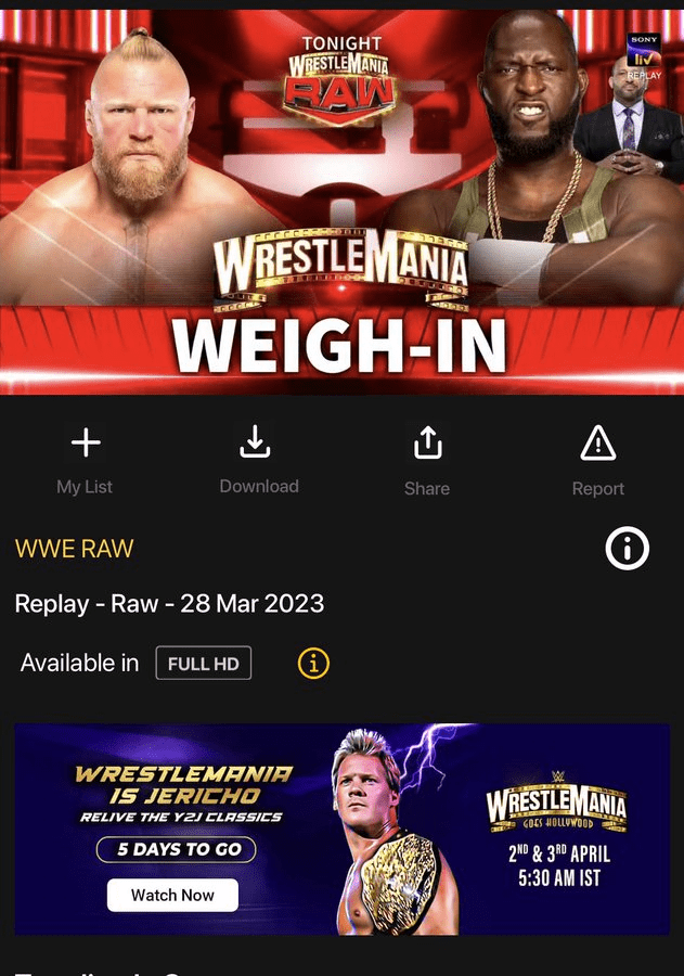 In preparation for the Showcase of the Immortals, WWE is continuously airing promotional content for their grandest show on all platforms. Moreover, a fan recently posted on Twitter about watching RAW on the Sony Liv OTT platform with the ‘WrestleMania is Jericho’ show advertisement popping up on his screen.