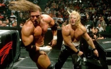 According to Jericho, the match was originally supposed to end with a belly-to-back suplex through the Spanish announce table, but him and Triple H came up with a new finish that saw The Game deliver a belly-to-back suplex to Jericho from a dasher board through Jim Ross and Jerry Lawler’s desk.