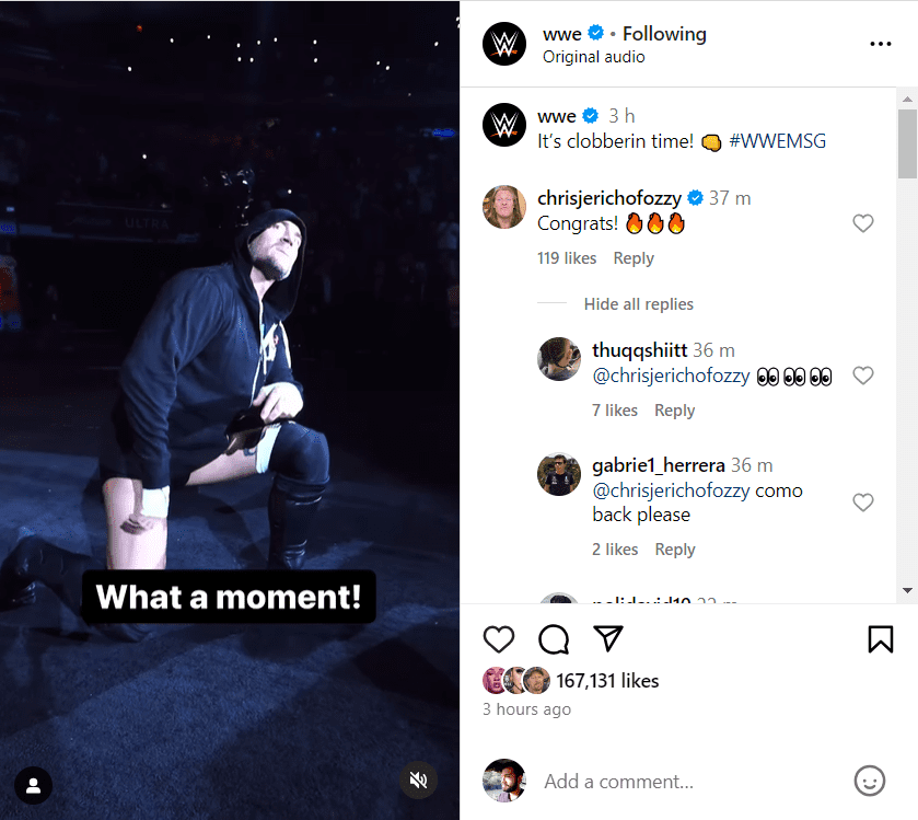 WWE uploaded a video of CM Punk’s grand entrance at Madison Square Garden on Instagram. Interestingly enough, Chris Jericho reacted to Punk’s WWE in-ring return in the video and simply congratulated Punk.