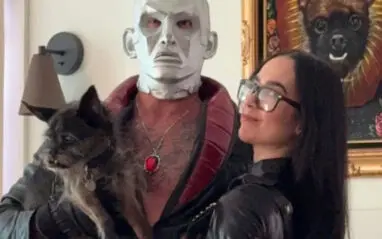 In the photo, CM Punk rocks a bald silver mask, a leather jacket zipped halfway to reveal a red medallion and tattoos, fully embracing the role of arms dealer Destro. AJ Lee stands beside him, suited up in a black tactical catsuit, large black-frame glasses, that completes her transformation into The Baroness. Oh, and Larry was also there!