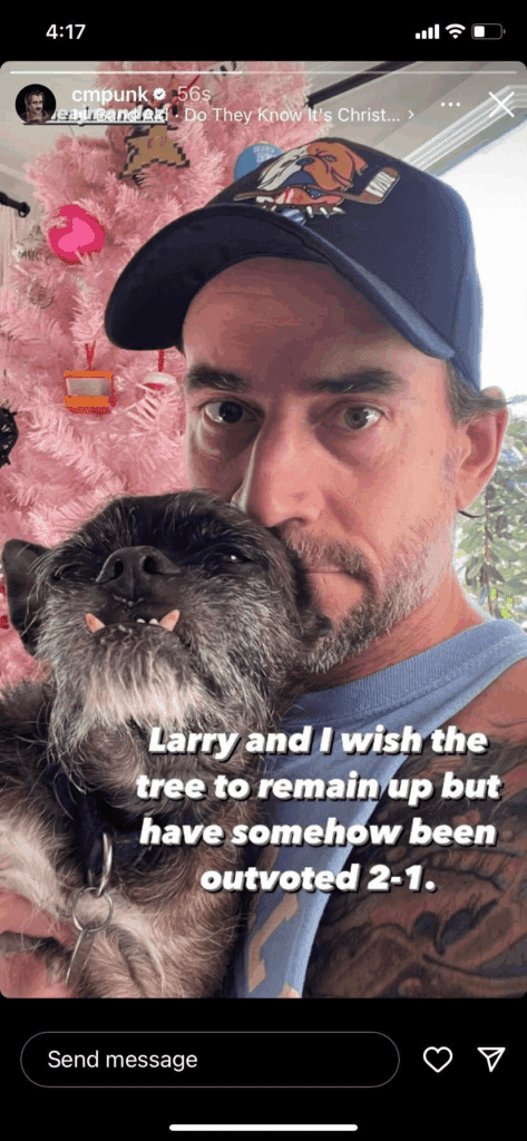 CM Punk and his dog, Larry are known to be closer than ever. However, the duo was seemingly outvoted on a certain matter by Punk’s wife and the potential head of the house, AJ Lee. Punk announced that his Christmas tree was being taken down on his Instagram story.