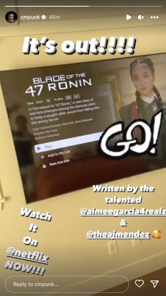 Punk promoted on his Instagram Stories the release of Blade of the 47 Ronin on Netflix. The film was co-written by Punk’s wife, AJ Mendez. It was nothing more than the menu of the film on the streamer and Punk telling his followers to go watch the film. Good for him to help out his wife.