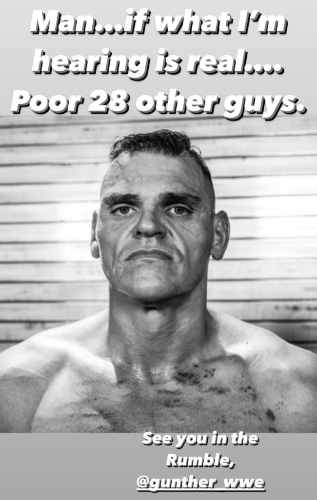 CM Punk took to his Instagram story and reacted to the news of Gunther competing in the Men’s Royal Rumble by expressing sympathy for the other 28 competitors, referencing a tweet by Keith Lee when Gunther had just changed his name from Walter. Punk then told Gunther that he would be seeing him in the Royal Rumble.