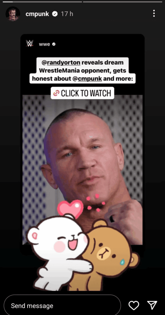 That being said, Randy Orton acknowledged their great reactions and maturely recognized that neither of them stepped on each other’s toes. Punk saw this, and he shared WWE’s link to Orton’s interview on his Instagram Story, adding a sticker to show love to Randy Orton. That hugging bear sticker Punk put on the story should send a message.