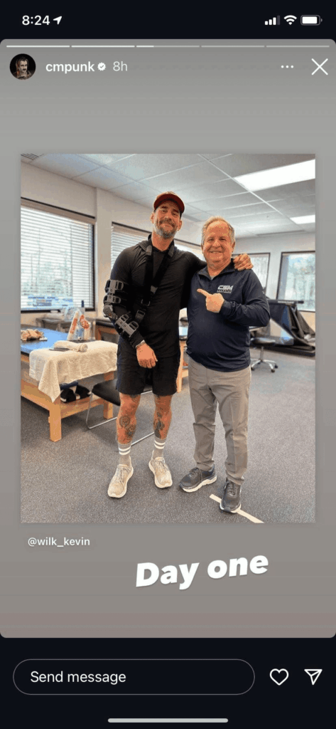 CM Punk, on the other hand, underwent successful surgery for his torn triceps and shared his Day One look on his Instagram stories with his hand in a supporter and posing with a person from the rehabilitation facility.