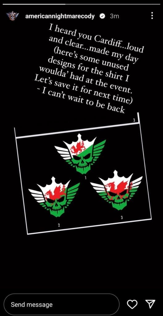 Cody Rhodes took to his Instagram Story on Sunday and shared an unused design he had planned on wearing to Cardiff had he not been injured. Check out Cody Rhodes’ message down below.