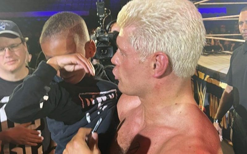 A fan recently took to Twitter and uploaded a photo of Cody Rhodes at a recent WWE live event, where Cody Rhodes stopped everything he was doing to comfort a crying child before giving him back to his parents.