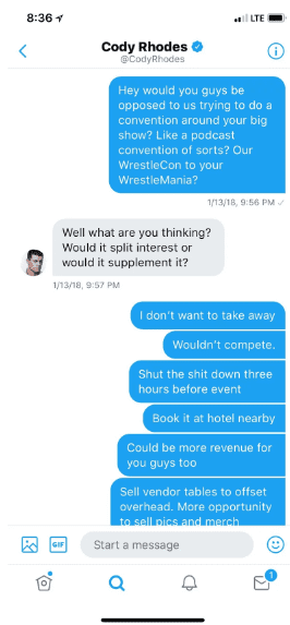 Thompson had the idea for Starrcast as early as January of this year. He revealed spotting Cody at the airport on the way home from the Tokyo Dome. Cody hit him up on Twitter asking if it was him, and one thing led to the next and Thompson ultimately had the chance to explain his idea to “The American Nightmare.”