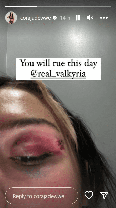 Along with a photo of her busted eye, Cora Jade also included a little warning to Lyra Valkyria, who beat her in the tournament and caused that facial damage.