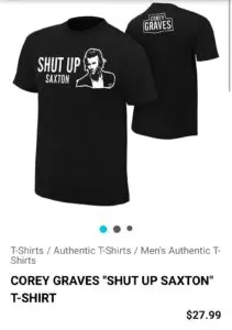 If you enjoy listening to Corey Graves tell Byron Saxton to shut up on SmackDown, then you’re obviously not the only one. The team in WWE’s merchandising obviously finds this funny as well and they recently gave Graves his own t-shirt for it.