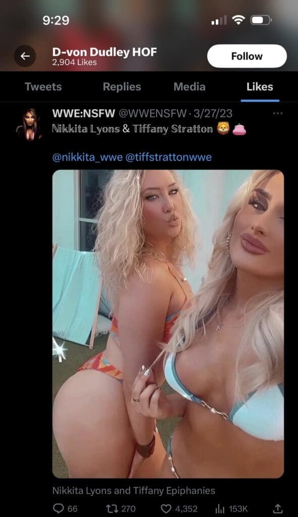 Nikkita Lyons and Tiffany Stratton’s little pool party was among the liked tweets on D-Von’s timeline. The was quite a surprise for fans to discovery. One even sent out a message to remind D-Von that we can all see what he likes on Twitter.