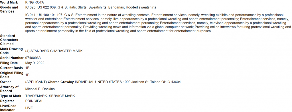 Kai is now making the change official. Paperwork filed with the United States Patent & Trademark Office indicates that on May 3, 2022, Dakota filed to protect the name “King Kota.” The legalese reads like a standard pro wrestling trademark document.