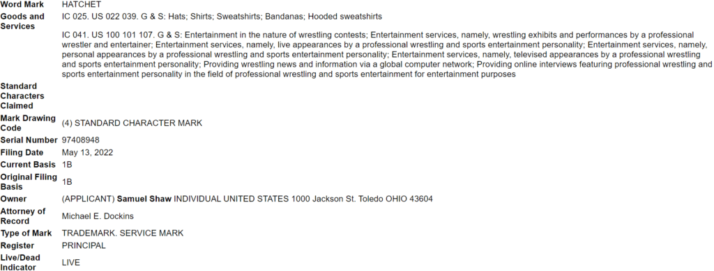 According to the US Patent and Trademark Office, Samuel Shaw filed to protect the name “Hatchet” on May 13, 2022. The paperwork was handled by trusted “gimmick attorney” Michael E. Dockins. Other than the name, it is a pretty standard trademark filing.
