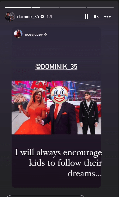 In response to Jey Uso’s posts, Dominik Mysterio decided to join in on the fun with a playful jab. He posted a humorous comment on one of Uso’s pictures, encouraging kids to follow their dreams while adding a comical twist with a reference to staying off drugs.