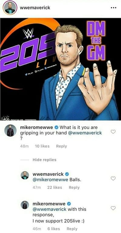 This led Maverick to respond with one word. “Balls.” This solved Rome’s issue, as the backstage interviewer for WWE claiming he now supports 205 Live.