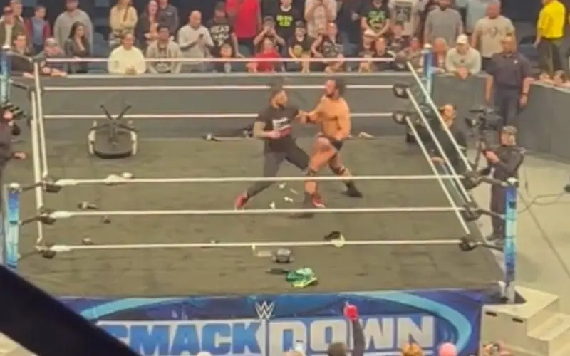 During the latest set of Friday Night Smackdown tapings, Roman Reigns came out during a contract signing for RK-Bro and The Usos. Immediately after that, Drew McIntyre came out and had a brief staredown before they started fighting.