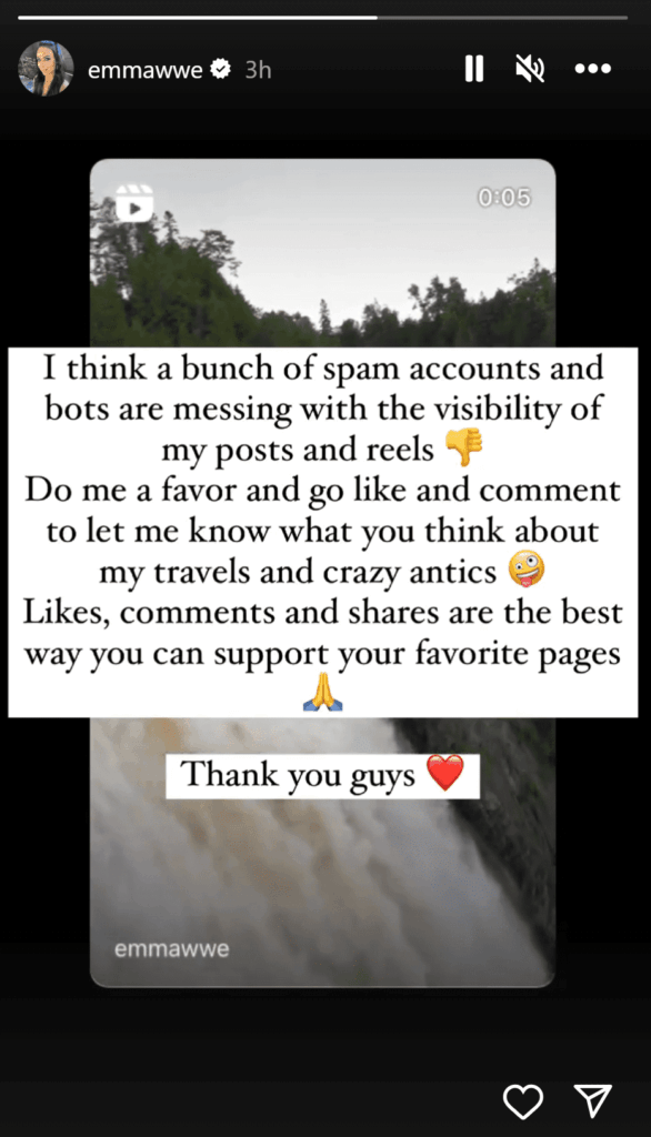"I think a bunch of spam accounts and bots are messing with the visibility of my posts and reels (thumbs down emoji) Do me a favor and go like and comment to let me know what you think about my travels and crazy antics (crazy face emoji) Likes, comments and shares are the best way you can support your favorite pages (praying hands emoji)."